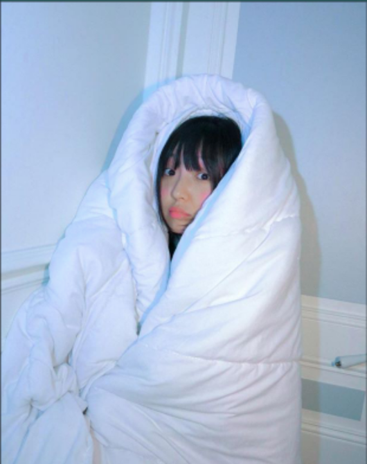 공개된 사진 속 민은 이불을 뒤집어 쓰고 얼굴을 내밀고 있다.