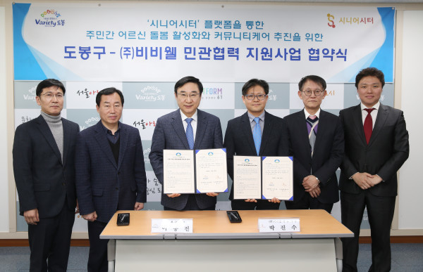 | ▲ 협약식에서 이동진 구청장(왼쪽에서 세 번째)과 (주)비비웰 관계자들이 기념촬영을 하는 모습. (사진제공=도봉구청) | ||