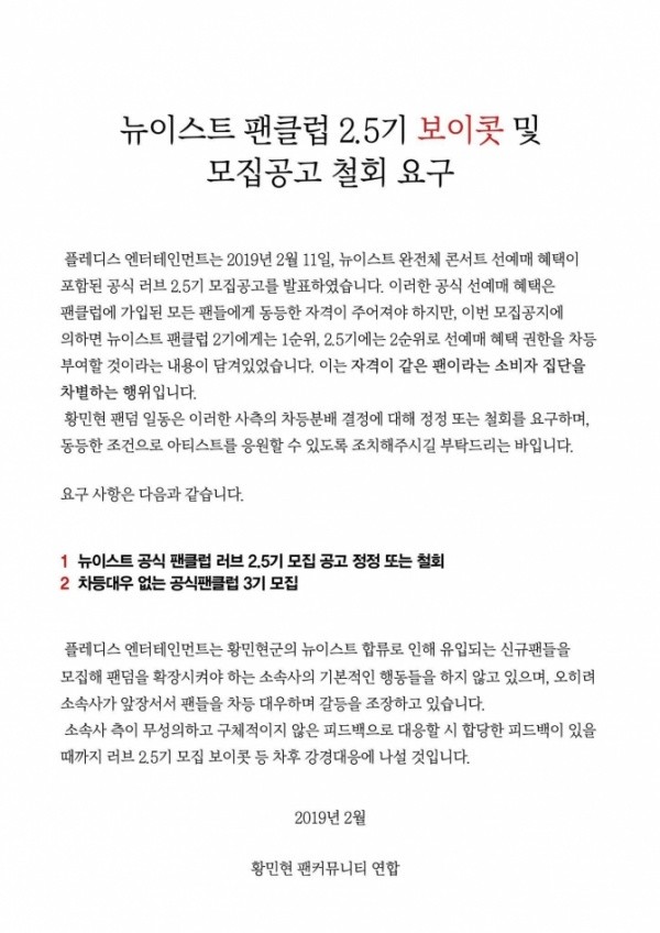 팬들은 같은 팬클럽 활동에도 불구, 혜택에 차별을 두는 것에 불만의 목소리를 드러내고 있다. 이에 한 온라인 커뮤니티에는 팬클럽 차별에 대한 성명서가 게재돼 뉴이스트 완전체 활동을 앞두고 잡음이 커지고 있다.