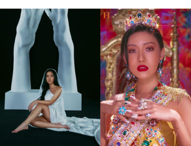 몽환적인 표정과 화려한 장신구가 화사의 섹시미를 더욱 돋보이게 한다.