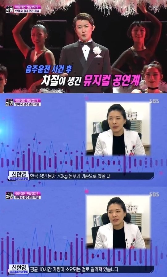 '본격연예 한밤'에 출연한 가정의학과 교수는 "성인 남성이 소주 1병을 분해하는데 10시간이 소요되는 걸로 알려져 있다." 라며 충분한 휴식을 취하지 않으면 술을 마신 다음 날이라도 혈중알콜농도는 높을 수 있음을 경고했다.