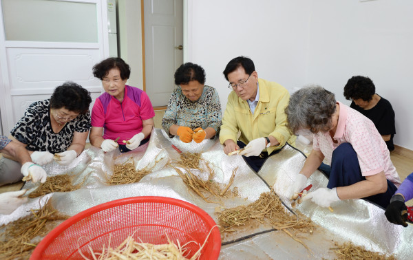 | ▲ ‘너나들이 공동작업장 1호점’에서 유덕열 구청장이 노인들과 함께 도라지를 다듬고 있다. (사진제공=동대문구청) | ||