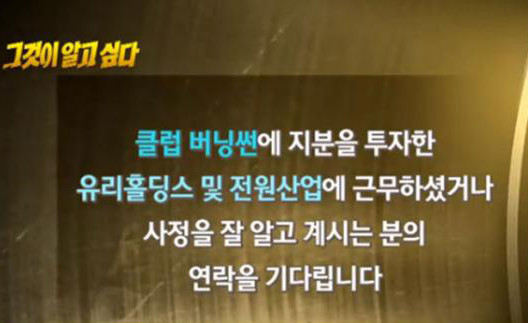 9일 '그것이 알고 싶다'는 이날 회차 방송이 끝난 이후 시청자들에게 제보를 독려했다. 이중 특히 "클럽 버닝썬에 지분을 투자한 유리홀딩스 및 전원산업에 근무했거나 사정을 잘 알고 있는 분의 연락을 기다린다"는 제보 독려가 많은 관심을 받았다.