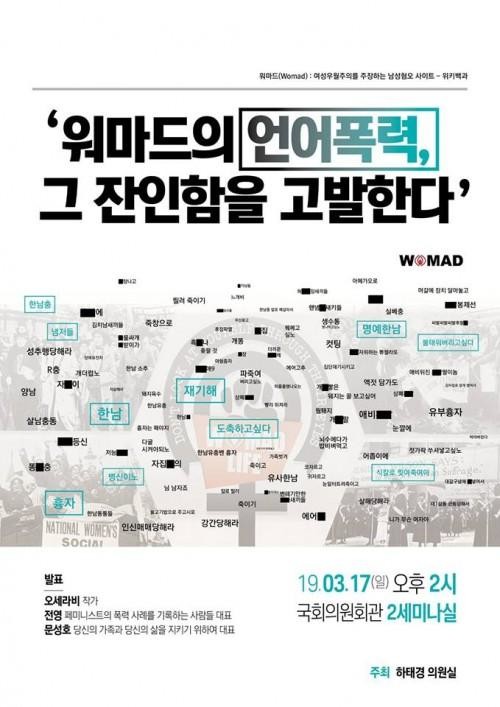 그는 "이번 토론회는 워마드에서 자행되는 언어폭력을 다룬다"며 "남성뿐 아니라 자신들의 의견에 동조하는 여성들에게까지 무차별적으로 가해지는 언어폭력은 우리의 상상을 초월한다"고 비판했다.