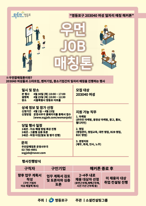 [시민일보=황혜빈 기자] 오는 30일 서울 영등포구(구청장 채현일) 영등포아트홀에서 20~40대 경력단절 여성과 구인기업의 일자리를 연계하는 ‘여성 일자리 매칭 해커톤(우먼잡매칭톤)’이 개최된다.