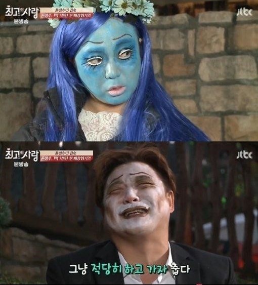 그리고는 자신의 얼굴을 파란색으로, 윤정수의 얼굴은 하얗게 바꿔놓으며 '유령신부'의 캐릭터로 변신을 시도했다.