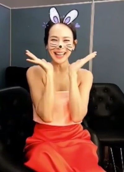 공개된 영상 속엔 오렌지색 의상을 착용한 조여정이 어플리케이션을 이용해 꽃받침 포즈로 환한 미소를 짓고 있다.