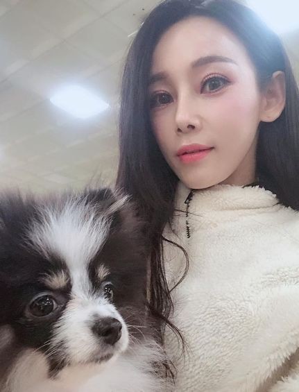 사진 속 지원이는 반려견과 함께 다정한 모습으로 셀카를 촬영 하고 있다.