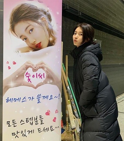 수지는 최근 자신의 인스타그램에 "헤메스 실장님들이 서프라이즈로 밥차를,, 감동 감동 완전 맛집.. 잘먹었슴다 꺼억"이라는 글과 함께 사진 한 장을 게재했다.