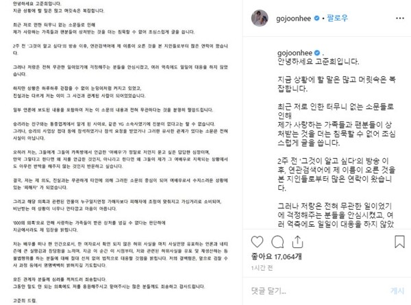 마지막으로 고준희는 "모든 관계자 분들께 심려를 끼쳐드려 죄송합니다. 그동안 말도 안 되는 의혹에도 저를 응원해주시고 믿어주시는 많은 분들께도 죄송하고 감사드린다"고 글을 마무리 했다.