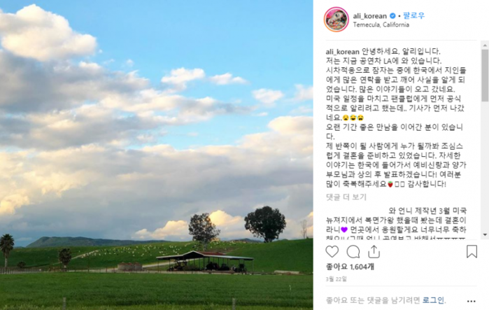 알리는 "미국 일정을 마치고 팬클럽에게 먼저 공식적으로 알리려고 했는데 기사가 먼저 나갔네요"고 적었다.
