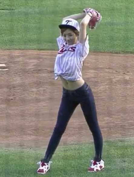 시구를 위해 마운드에 오른 안소미는 LG의 모자와 유니폼 상의, 스키니진을 입고 등장했다.
