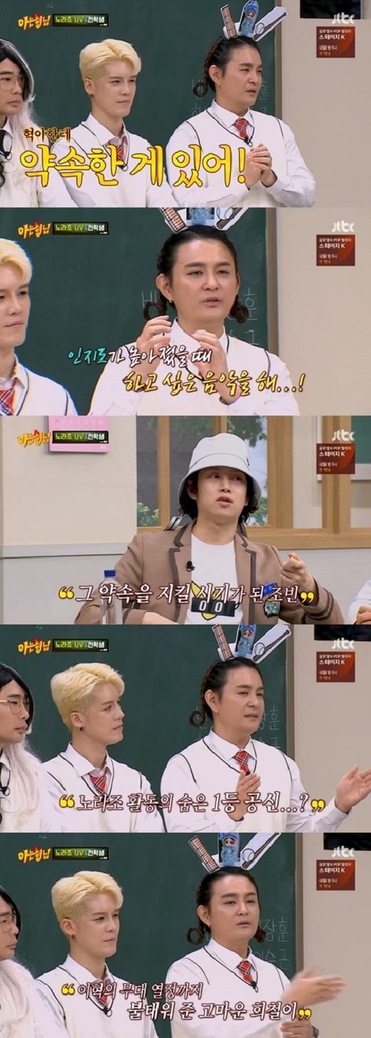 최근 방송된 JTBC '아는 형님'에는 그룹 노라조(조빈, 원흠)가 전학생으로 출연해 다양한 이야기를 나눴다.