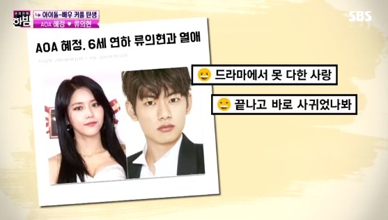 최근 방송된 SBS '본격연예 한밤'에서는 AOA 혜정과 신인배우 류의현의 열애 사실이 조명됐다.