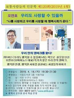 ‘보통사람들의 인문학’은 2009년부터 매월 셋째주 목요일 1회 이상 야간 시간대에 문학, 예술, 사회, 철학 등 분야별 인문학 강연을 마련하여 11년째 시민들과 함께 하고 있으며, 4월 ‘보통사람들의 인문학’은 120회를 맞는다.