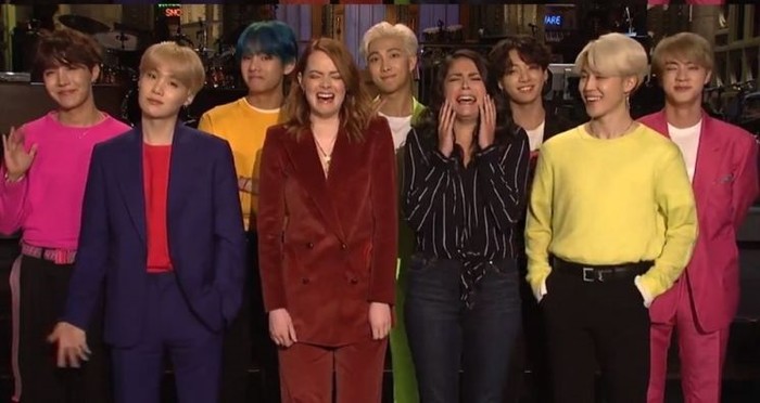 방탄소년단은 이날 생방송으로 진행된 미국 NBC ‘SNL’에 호스트 엠마 스톤의 소개를 받으며 등장했다. 엠마 스톤은 오프닝 무대에서 "BTS is here!"이라고 외쳤고 현장 팬들은 뜨거운 함성으로 방탄소년단을 반겼다.