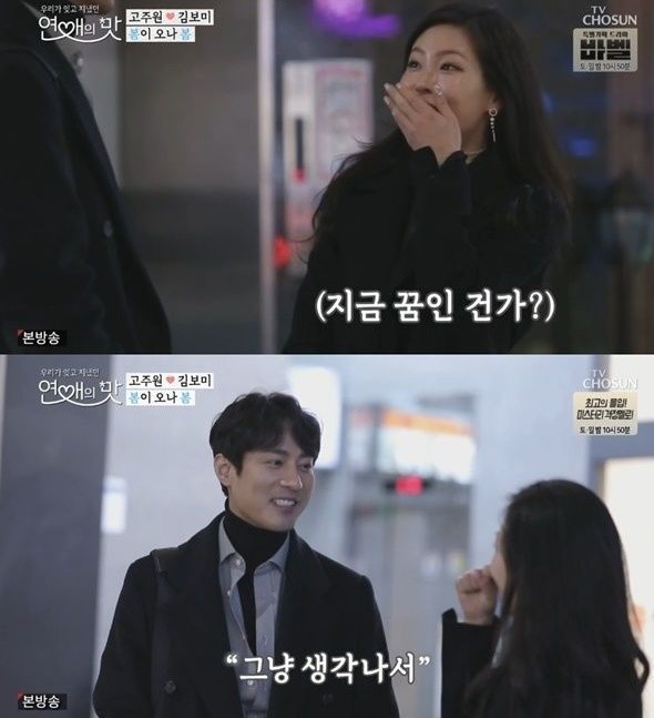 지난 1월 31일 방송 된 TV조선 ‘연애의 맛’에서는 고주원과 김보미의 모습이 그려졌다. 고주원은 이날 김보미를 보기 위해 아무 말 없이 부산행 비행기에 몸을 실었고 김보미가 다니는 영어 학원을 두 시간 동안 수소문한 후 학원 앞에서 김보미를 기다렸다.