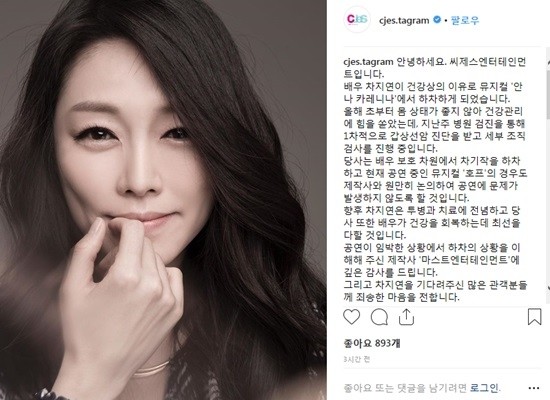 소속사 씨제스엔터테인먼트는 지난 15일 공식 인스타그램을 통해 차지연이 지난주 병원 검진에서 갑상선암 진단을 받았다고 밝히며 뮤지컬 하차 소식을 알렸다.