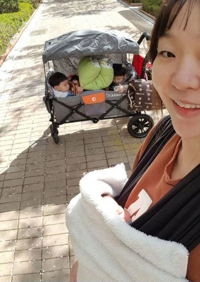 사진 속 정주리는 셋째 아들을 품에 안은 채 첫째, 둘째의 유치원 등원을 돕고 있다. 그는 "막내는 강제 배웅 #여보나해냈어"라는 말을 덧붙이며 엄마의 위대함을 뽐냈다.