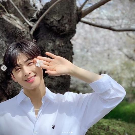 공개된 사진 속에는 만개한 벚꽃을 배경으로 카메라를 응시 중인 차은우의 모습이 담겨 있다. 특히, 손에 꽃잎을 한 장 들고 환하게 웃고 있는 차은우의 미소가 보는 이들을 설레게 한다.