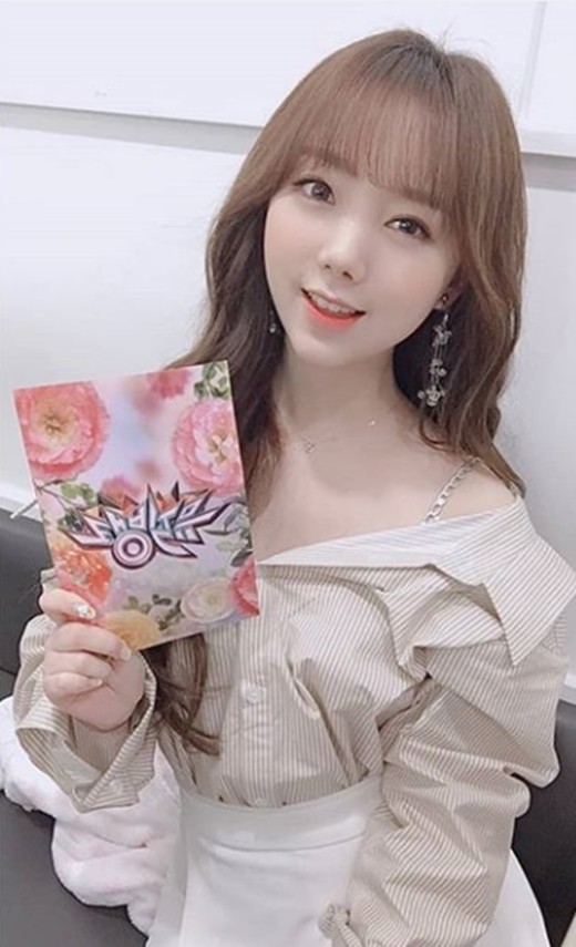 공개된 사진에는 KBS 2TV '뮤직뱅크' 큐카드를 들고 카메라를 보며 환히 웃는 케이의 모습이 담겨 있다. 오프숄더 블라우스로 청순함에 반전 섹시미를 더한 모습이 인상적이다. 특히, 깜찍하게 미소 짓는 케이의 모습이 상큼함을 자아낸다.