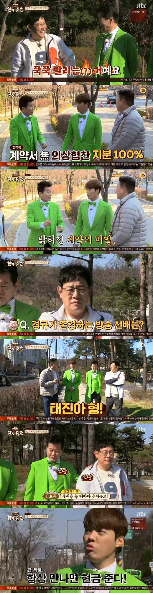 이를 듣던 이경규는 "에너지가 팍팍 온다"라고 말했고 강남은 "그 때 저도 물어봤다. 태진아 형님이 제일 좋다더라. 만나면 현금 준다고 하더라"라고 덧붙여 이경규를 당황하게 했다.