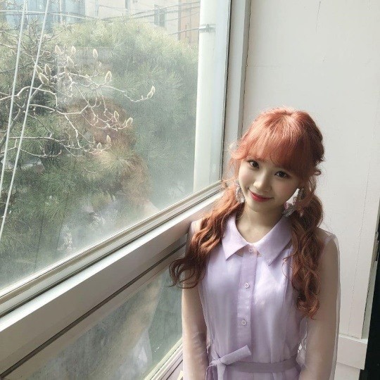 공개된 사진 속 김채원은 양갈래 머리를 하고 연보라색 원피스로 청순미를 뽐내며 창가에 서있다. 오렌지색 헤어스타일이 상큼한 김채원의 미모를 더욱 돋보이게 한다.