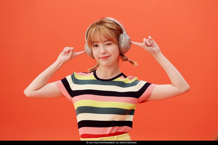 공개된 사진 속에는 아이유가 헤드셋을 쓰고 깜찍한 표정을 짓는 모습이 담겨있다. 양갈래 머리와 줄무늬 티셔츠로 상큼함을 더하고 살짝 윙크를 하는 모습이 시선을 사로잡는다. 특히, 아이유의 오렌지빛 헤어컬러가 뽀얀 피부를 더욱 돋보이게 한다.