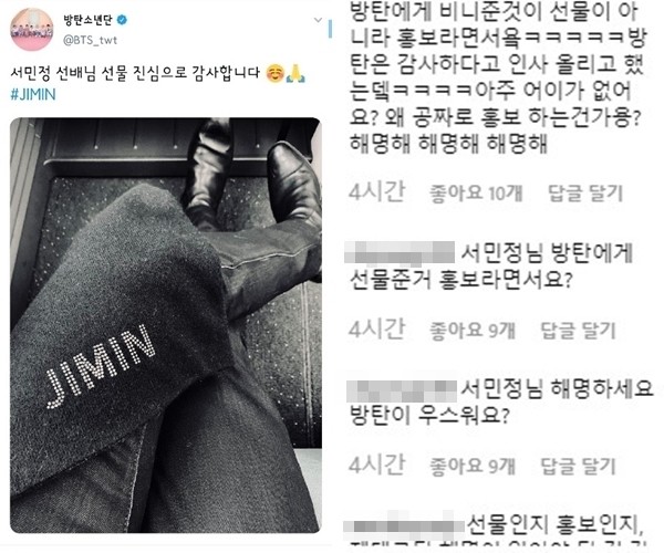 하지만 팬들은 서민정의 인스타그램 댓글창에 "서민정님 방탄소년단에 준게 선물이 아니라 홍보라면서요? 해명하세요"라며 항의글을 올리며 누리꾼들의 이목을 모으고 있다.