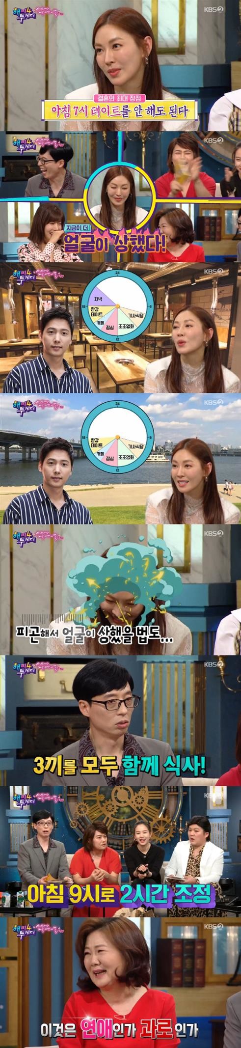 이어 그는 "어머니가 '50부작 드라마를 촬영할 때 보다 이상우와 연애를 할 때 얼굴이 더 상했다'고 하더라"며 때아닌 데이트 부작용을 호소해 폭소를 유발했다. 이어 "결혼해서 아침 7시 데이트를 안 해도 되어서 좋다"고 덧붙여 시청자들에게 웃음을 안겼다.