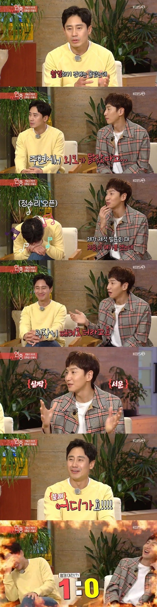이날 신하균은 이광수와 닮은 점에 대해서 "하기 전에는 몰랐는데, 주변에서 외모가 조금 닮았다고 하더라. 의아하지 않냐"라고 말하며 웃음을 터뜨렸다.