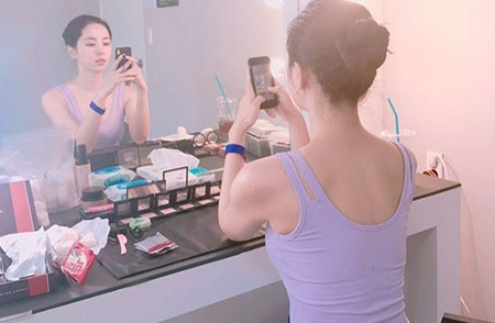 공개된 사진 속 한채아는 라인의 훤히 드러난 운동복 차림으로 의상실에 앉아 머리를 질끈 묶인 모습으로 자신의 모습을 담고 있다.