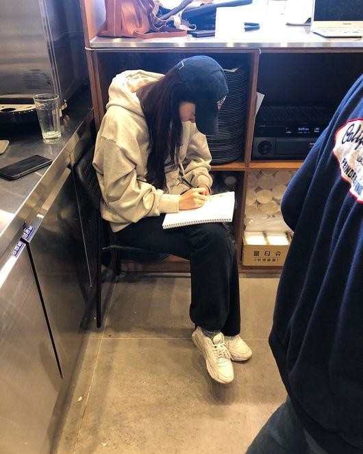 공개된 사진 속 김소영은 의자에 앉아서 노트에 무언가를 적고 기록 중이다. 이때 김소영은 회색 후드티를 입고 흰색 운동화를 신었다. 임부복은 아니지만 편안한 차림이다.