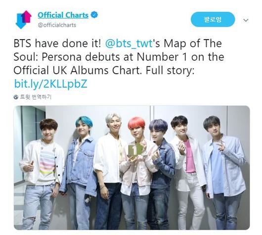 무엇보다 눈에 띄는 점은 영국 차트까지 방탄소년단의 위엄을 알린 것. 19일(현지시간) 영국 오피셜 차트에 따르면, 방탄소년단은 ‘MAP OF THE SOUL : PERSONA’로 ‘오피셜 앨범 차트 톱 100 1위를 차지했다.