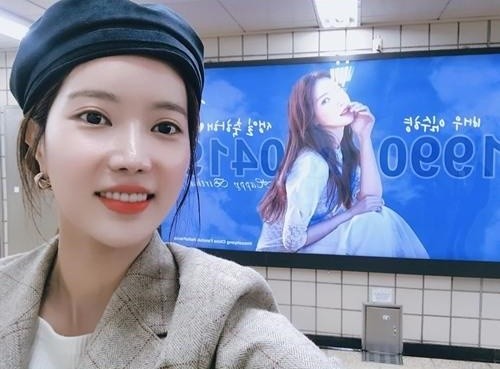 공개된 사진에는 서울 청담역에 걸려 있는 자신의 생일 축하 전광판 앞에서 인증샷을 남기고 있는 임수향의 모습이 담겨 있다.