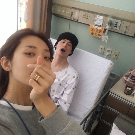사진에는 환자복을 입은 김원중과 손하트 포즈를 취하고 있는 아내 곽지영의 모습이 담겨있다.