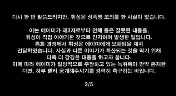 휘성은 에이미가 주장하는 성폭행 모의 의혹 사실을 전달한 대상 B씨에게 전화를 걸어 "내가 그런 말을 할 이유도, 일도 없다"며 "살해 협박 모의라고 했다가 강간 모의라고 하면서 말이 자꾸 바뀐다"고 했다. 이에 B씨는 "네가 그 말을 할 일도 없고, 너는 에이미랑 제일 친했었고 네가 에이미 욕했을 때 네가 화가 나서 나랑 싸웠다"라고 말했다.