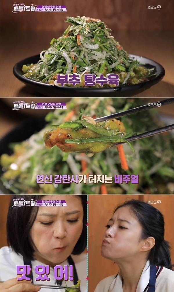 이날 김숙-이세영은 부추 탕수육의 비주얼에 한번 놀라고, 맛에 또 놀랐다. 부추 탕수육을 맛본 이세영은 "젓가락을 집을 때부터 쫀득함이 느껴진다"면서 감탄했다.