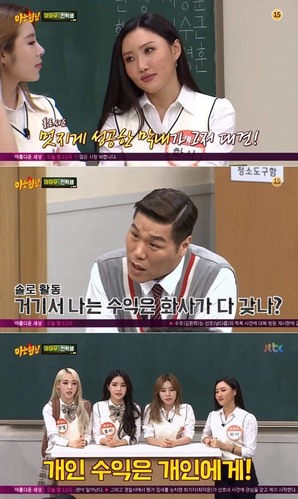 최근 방송된 JTBC 예능프로그램 '아는 형님'에는 걸그룹 마마무(솔라, 문별, 휘인, 화사)가 전학생으로 등장했다.