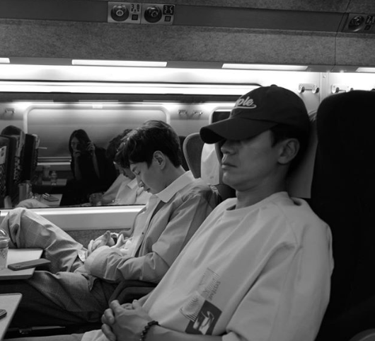 이광수는 20일 자신의 인스타그램에 이솜이 찍어준 한 장의 사진을 게재했다. 공개된 사진을 보면, KTX에 오른 이솜이 신하균과 이광수가 깜빡 잠이 든 모습을 포착해 순간을 담았다.