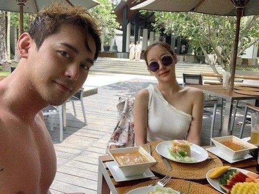 공개된 사진 속 김상혁은 리조트 내 실내 수영장을 배경으로 송다예와 식사를 즐기는 모습이다. 방즘 전 수영을 끝냈는지 두 사람의 몸에는 물방울이 맺혀있다.