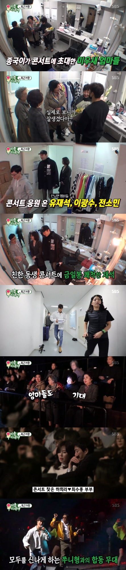 이날 김종국은 감기로 인해 컨디션이 좋지 않아 걱정했다. 일찍부터 분주하게 준비하며 공연장으로 향했다. 김종국은 공연에 ‘미우새’ 어머니들을 초대했다. 어머니들은 꽃다발을 들고 대기실에 와서 김종국에게 힘을 실어줬다. 홍진영 어머니는 “실제로 보니 잘생겼다”면서 칭찬했다. 토니 어머니는 “사윗감으로 삼으라”면서 큐피드를 자처했다.