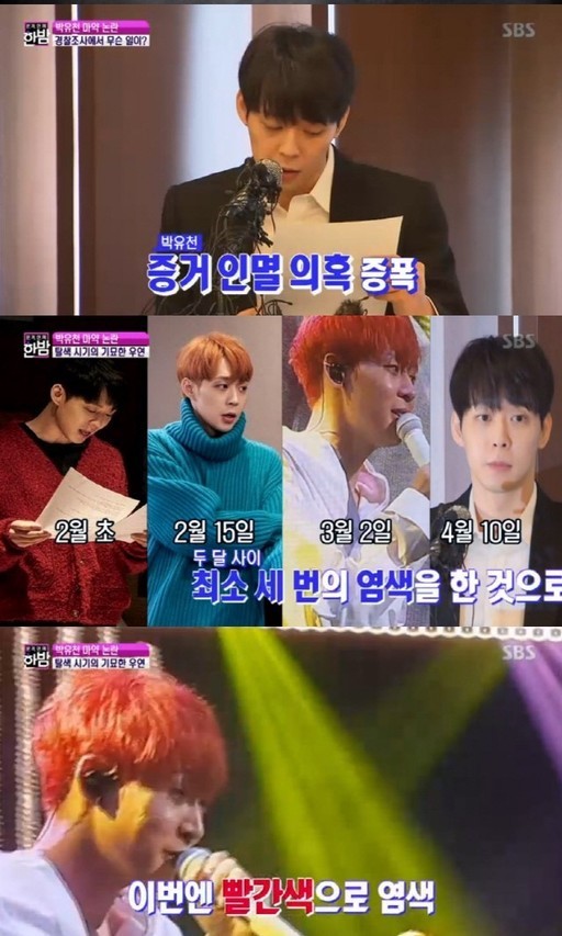 이날 ‘본격연예 한밤‘ 제작진 측은 “경찰 조사 직전 박유천이 염색과 탈색을 진행했다”며 “데뷔 15년 만에 파격 변신이었다. 2월부터 머리 색이 변했다. 눈썹까지 변했다. 이후 빨간색으로 또 다시 염색했다”고 보도했다.