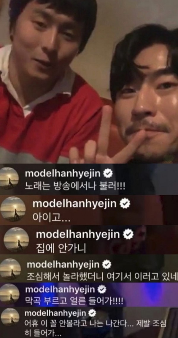 한혜진은 "미쳤구먼" "노래는 방송에서나 불러" "아이고 집에 안가니" "조심해서 놀라했더니 여기서 이러고 있네" "막곡 부르고 얼른 들어가" "어휴 이 꼴 안볼라고 나는 나간다. 제발 조심히 들어가"라는 말을 남겼다.