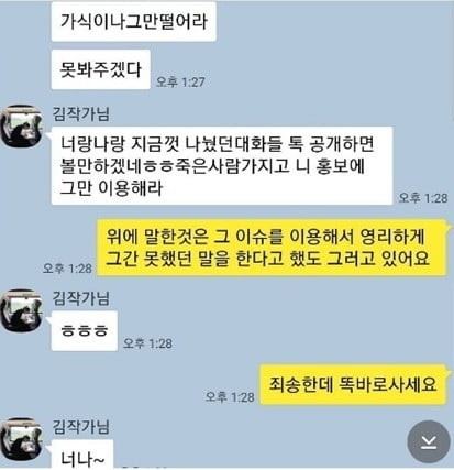 대화 내용에 따르면 김수민 작가는 "죽은 사람 가지고 네 홍보에 그만 이용해라"라고 지적했고 윤지오는 "죄송한데 똑바로 사세요"라고 응수했다.