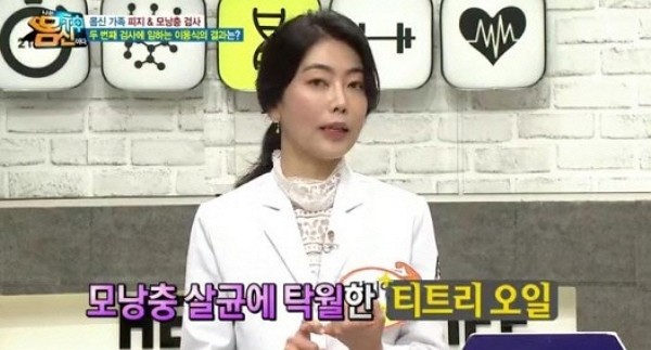 이날 김지영 피부과 전문의는 피지와 모낭충을 없애는 방법으로 티트리 오일 세안을 제안했다. 김지영 전문의는 "세안하실 때 티트리 오일 한 두 방을 떨어뜨리고 세안하면 모낭춘 살균에 탁월하다"고 설명했다.