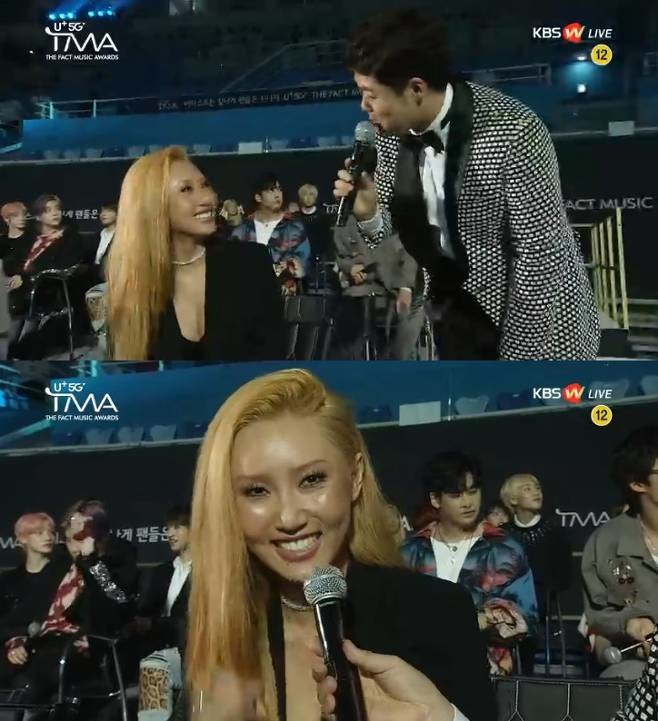 지난 24일 인천 남동체육관에서 열린 '더팩트 뮤직 어워즈'에서 MC전현무는 마마무와의 인터뷰를 진행하는 모습이 시청자들을 찾아갔다.