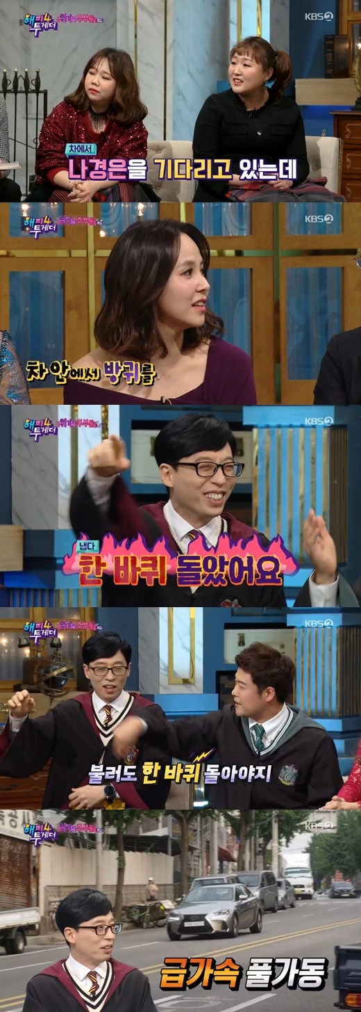 유재석은 "그런데 그 순간 나경은이 나오더라. 나는 놀라서 시동을 걸고 혼자 동네를 한 바퀴 돌았다"며 "그 때는 나경은이 부르는 것이 문제가 아니었다. 급가속을 했었다"고 고백해 웃음을 자아냈다.