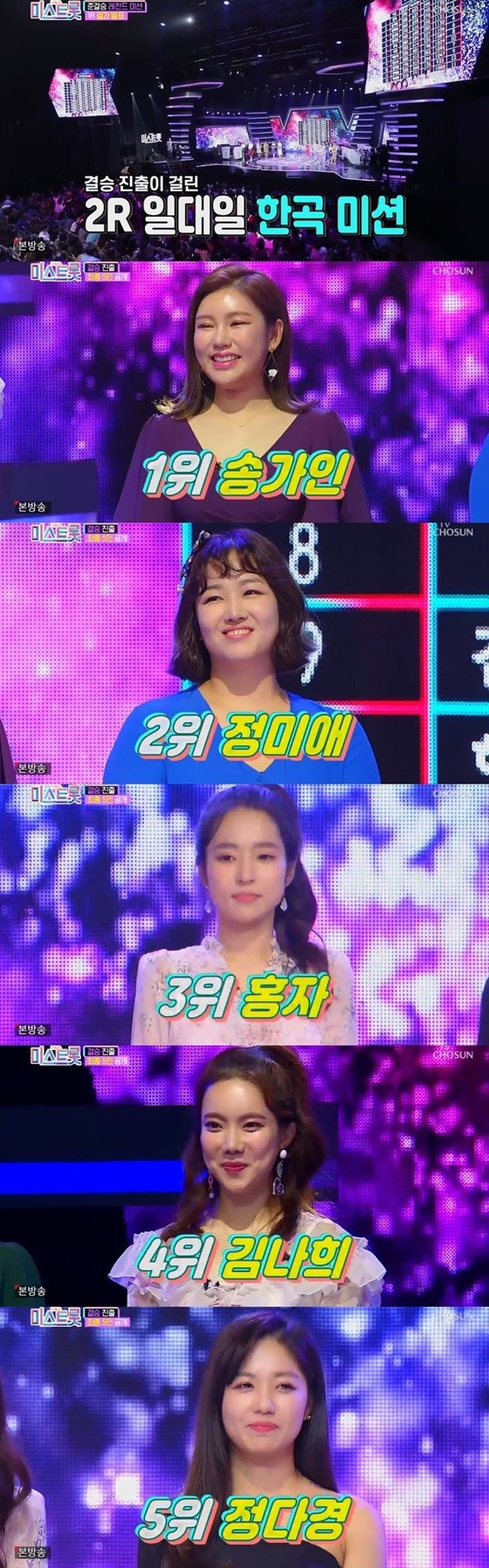 결국 2라운드 결과까지 합산해 최종적으로 결승전에 오른 5인은 송가인, 정미애, 홍자, 김나희, 정다경이었다.