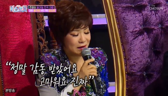 특히 원곡자인 김연자는 노래를 듣고 뜨거운 눈물을 쏟았다. 김연자는 “처음으로 김연자라는 이름을 알린 곡이다. 이 노래가 너무 너무 어려웠다. 지금도 컨디션이 나쁘면 음이탈을 할 정도로 굉장히 어려운 곡을 두 분이 열창을 하며 끝내주게 잘 불렀다. 정말 고맙다”라며 감격스러워 했다.